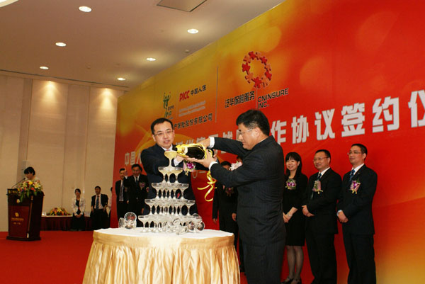 人保财险副总裁降彩石与泛华集团董事长兼CEO胡义南开启合作香槟