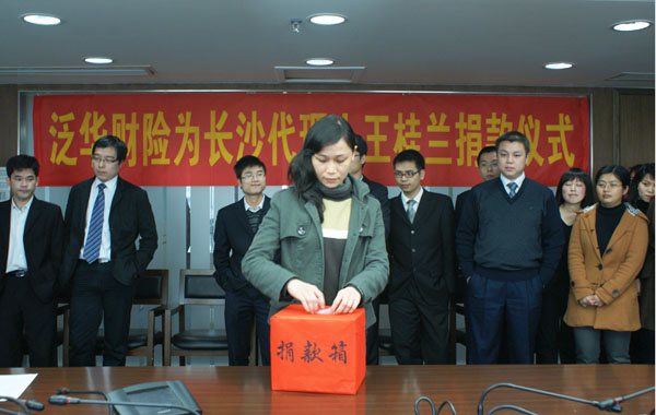 为了帮助王桂兰伙伴度过最艰难的时期,长沙公司立刻组织了捐款活动,并将此事告知营业集团。泛华财险营业集团得知此事上下立即行动起来,向财险全国发布了《为王桂兰伙伴捐款的倡议书》。在财险营业集团总裁室的带领下,财险本部全体员工在21楼大会议室随即举行了捐款仪式。在捐款仪式开始之前,汪春林总裁做了会前动员,表达了对王桂兰伙伴的慰问及祝福,倡导“一方有难八方支援”,并带领总裁室率先捐款献出爱心。本部所有在司员工也均纷纷伸出援助之手,献上自己的爱心。捐款仪式结束后,汪春林总裁带领大家沉默一分钟,为王桂兰伙伴送上真心的祝福。
