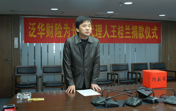 1月25日下午2点半,银海大厦21楼大会议室,这里正在举行的“泛华财险为长沙代理人王桂兰捐款仪式”为这寒冷的冬日注入一股暖流。