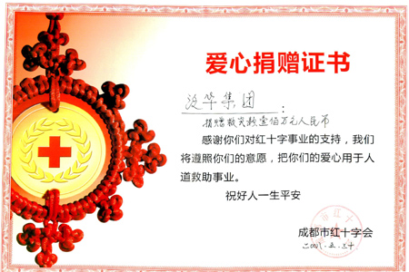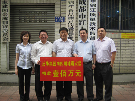 日前,四川灾区重工作正在紧锣密鼓地进行,为了进一步援救灾区同胞,帮助更多的人重建家园,尤其是帮助那些失去校园的孩子们,5月30日,泛华集团董事长胡义南在四川泛华各保险和金融机构领导的陪同下来到成都红十字会,代表泛华集团向灾区捐款人民币100万元,支持灾后学校的重建工作,成都红十字会秘书长郭勇强先生接受善款并致谢。