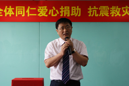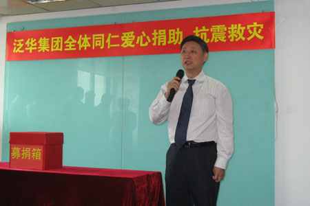 泛华董事长胡义南在募捐现场向灾区人民表达慰问