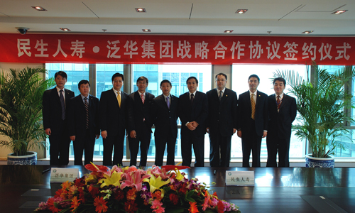 2008年4月11日,泛华保险服务集团与民生人寿保险股份有限公司在民生人寿大厦签署了战略合作协议。民生人寿保险股份有限公司总裁段景泉先生,总裁助理李越先生,泛华保险服务集团总裁赖秋萍先生,副总裁、寿险事业部主席李成斌先生,副总裁、寿险事业部副主席金锋先生出席了签约仪式。