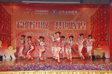 元宵节举办大型表彰晚会作为泛华有始以来的传统已经举办了10届,目的在于通过晚会表彰在一年里辛勤付出的泛华员工。此次表彰晚会共表彰了全国11个省市泛华保险新星、银星、金星、服务明星、优秀经理人、泛华年度之星等61个泛华年度保险个人;泛华金融最佳新人、年度精英、年度钻石之星、优秀经理人等40个泛华年度金融个人,以及泛华保险年度8个优秀团队和泛华金融年度3个优秀团队。其中,胡董带领的上市工作小组获得了2007年度团队大奖。泛华如此多的荣誉及奖励是对泛华每位员工一年里辛勤付出的充分肯定,每年的元宵节也成了泛华集团上下一起欢庆的日子。