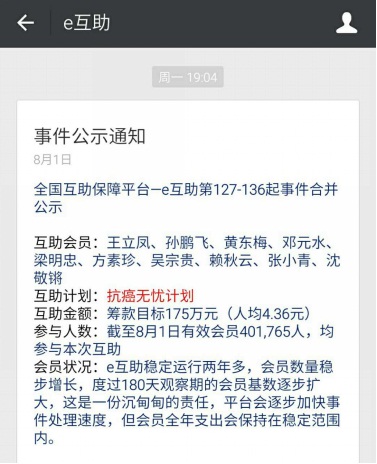 e事件10位罹患癌症会员公示通知