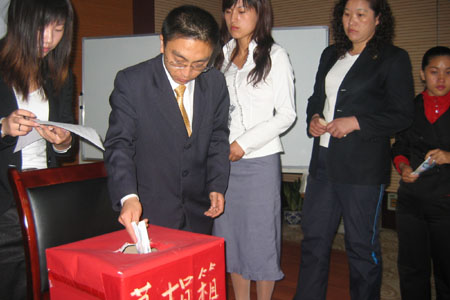 “这是心的呼唤,这是爱的奉献;这是人间的春风,这是生命的源泉……死神也望而却步,幸福之花处处开遍……只要人人都献出一点爱,世界将变成美好的人间”,在《爱的奉献》的背景音乐中,山东泛华参加民生培训班的学员们郑重将个人捐款投入捐款箱,为灾区人民贡献自己的一份力量,表达自己的一片爱心。 参加民生人寿山东分公司“首届种子讲师培训班”的业务骨干在捐款 5月12日-15日,来自全省各分支机构的37名业务骨干参加了民生人寿山东分公司为期3天的“首届种子讲师培训班”。当学员们得知公司开始为灾区募捐时,纷纷打电话要求参加活动。15日一早,在培训驻地现场组织了一次募捐活动,出现了开头的一幕。 经过统计,培训班学员共捐款3000余元,现已将捐款汇集到山东省公司。其他机构的募捐还在进行中,已有许许多多的伙伴伸出了援助之手。莱芜的伙伴们已捐款2000多元;济南泛融的朱哲总经理在临沂发回消息说:“伙伴们太优秀了,捐款现场很让人感动,我为和他们在一起而自豪。” 山东泛华15日晨宋阳报道