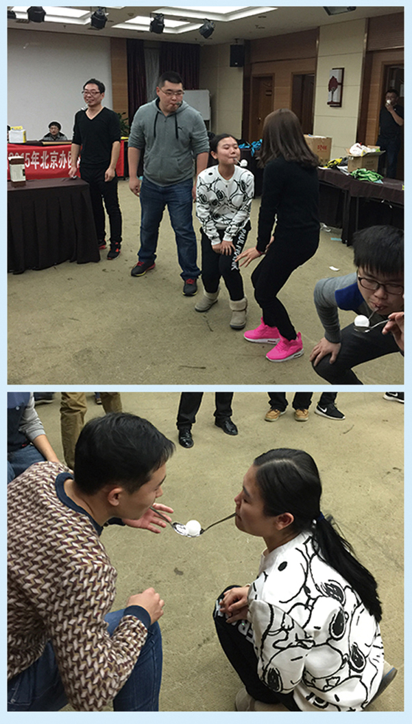 小游戏:害你在心口难开。分成2队,咬着勺子送接乒乓球给下一人。每队中安插一个内奸,互相配合,在互动中要找出对团队整体产生伤害的内奸。