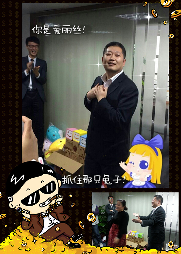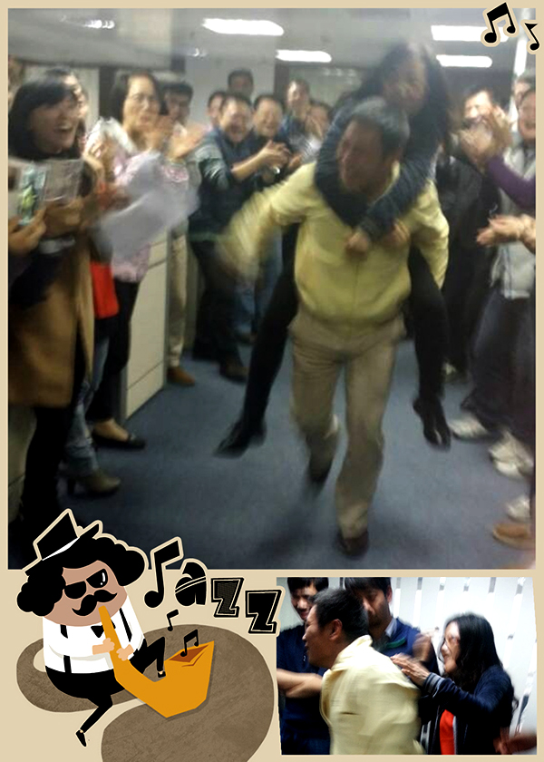 “猪八戒背媳妇咯!”伴着熟悉风趣的《西游记》插曲,运营中心(副总监)曾曲波总背起营销管理部(副总经理)易芯羽总饶跑办公区并连续喊着“易芯羽,祝你节日快乐!…”全场人员乐得前仰后合。