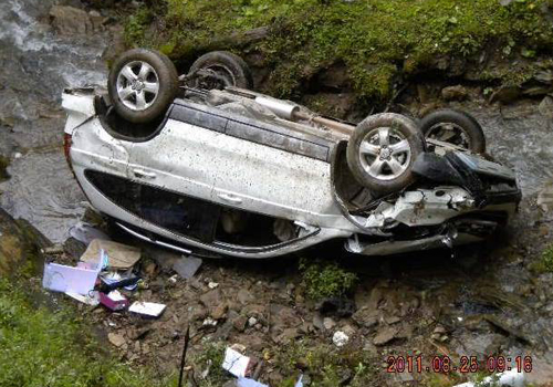 7小时的路程可谓分分惊心、秒秒艰险。驾驶员必须打起十二分的精神小心翼翼的前行。然而由于路况颠簸、下雨路滑且道路路桩设施不完善,在驶上一个60度的陡坡时,险情出现了。西昌机构购买不到半年的崭新的越野车侧翻滑出了道路,自50余米高的山腰跌至山涧,在坠落的过程中连续4次翻滚,落地时车身已是面目全非,值得庆幸的是车上人员生命无虞。