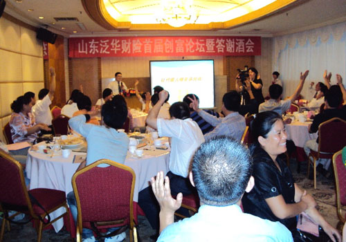 山东泛华民泰李涛总经理就“论坛”和“答谢”两个主题致辞,并指出泛华的目标是要让国人人人拥有保单,让每一个代理人都能够在泛华的平台上找到自己的位置,成就价值,实现财富梦想,并备受社会尊重。徐昭强总和营销管理部范经理分别就“团队长如何创富”及“如何让代理人赚更多的钱”做了重要分享,让代理人了解到泛华大平台、大产品、大渠道、大利润四大战略的实施,信息、产品、培训、服务四大平台的支持,以及内部激励政策下科学分配体系的运行,为代理人筑建了完善的后援支持平台,为保险行业精英与新锐提供了广阔的发展空间。