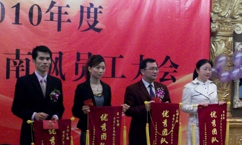 大会对广东南枫在2009年中工作表现优异的优秀团队和个人进行了表彰。评优中,广东南枫天河分公司、第一分部、花都分部和财务部共四个团队以突出的工作表现和优秀的成绩荣获了广东南枫2010年优秀团队奖。随后,公司还颁发了业务明星、优秀新人奖以及服务明星等优秀个人奖项。优秀个人代表纷纷上台表述心声,表示在2010年将以更加饱满的热情投入到工作中,为广东泛华南枫的发展做出更多的贡献。