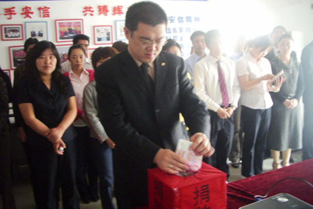 14日一大早,安信总公司就召开了一场特别的晨会,在晨会上,总经理刘力冲将灾区的损失和救援情况和以及我们在四川的兄弟机构的情况向全体员工做了详细的介绍,董事长薛凯、总经理刘力冲带有头捐款,每人捐出了1000元,员工们也你100,我200,将满含深情的爱心入进了捐款箱,经过统计,短短十几分钟,安信总公司的内勤员工们就捐出了7000多元。很多出差在外的员工纷纷找电话表示回到公司后也要积极捐款,表达对灾区人民的关爱。