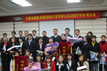2008年元月26日,东莞南枫佳誉2007年终总结暨优秀员工表彰大会在东莞市华凯广场会议厅召开。泛华保险服务集团旗下东莞南枫佳誉各领导及全体员工共200多人参加会议,集团总裁赖秋萍、副总裁兼财险经营委员会主席汪春林、首席信息运营官金锋参加了大会。